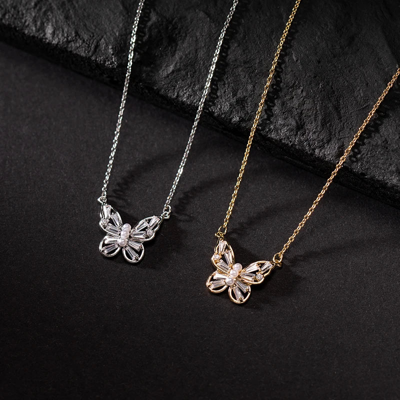 Elegant Fly Theme Gold and Silver Plated Butterfly Pendant Necklace Zircon and Imitation Pearl Butterfly Pendant Clavicle Chain