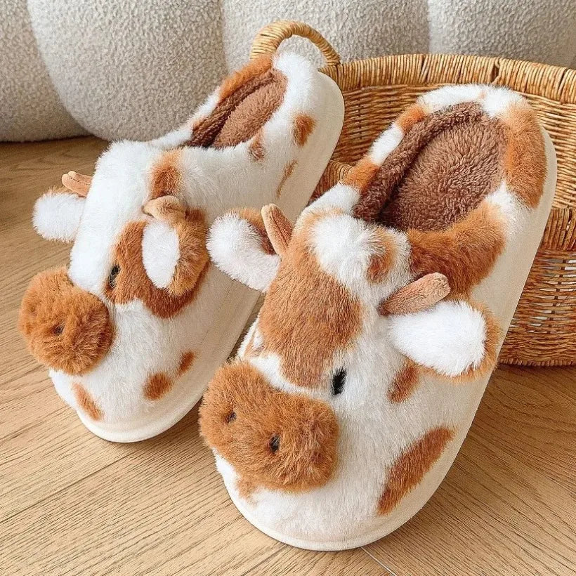 Cow Cartoon Plush Slippers – Kawaii Non-Slip Indoor Winter Shoes for Women & Men