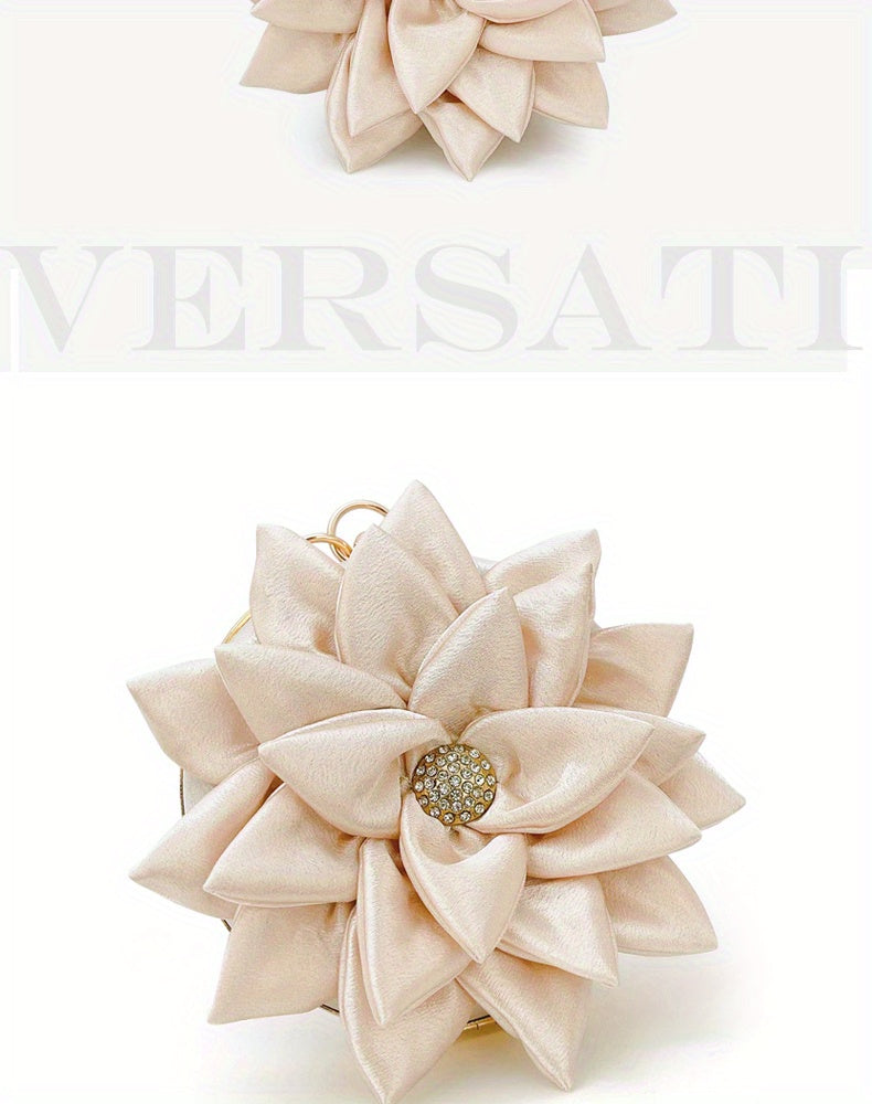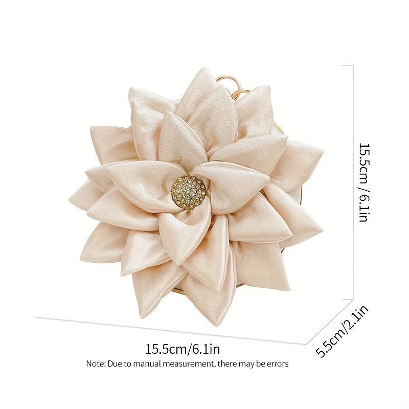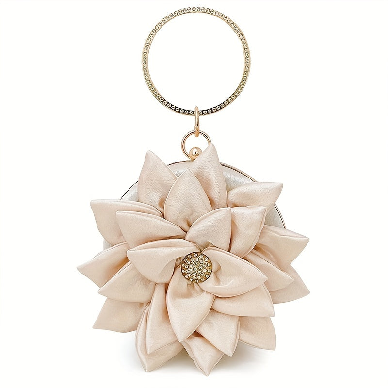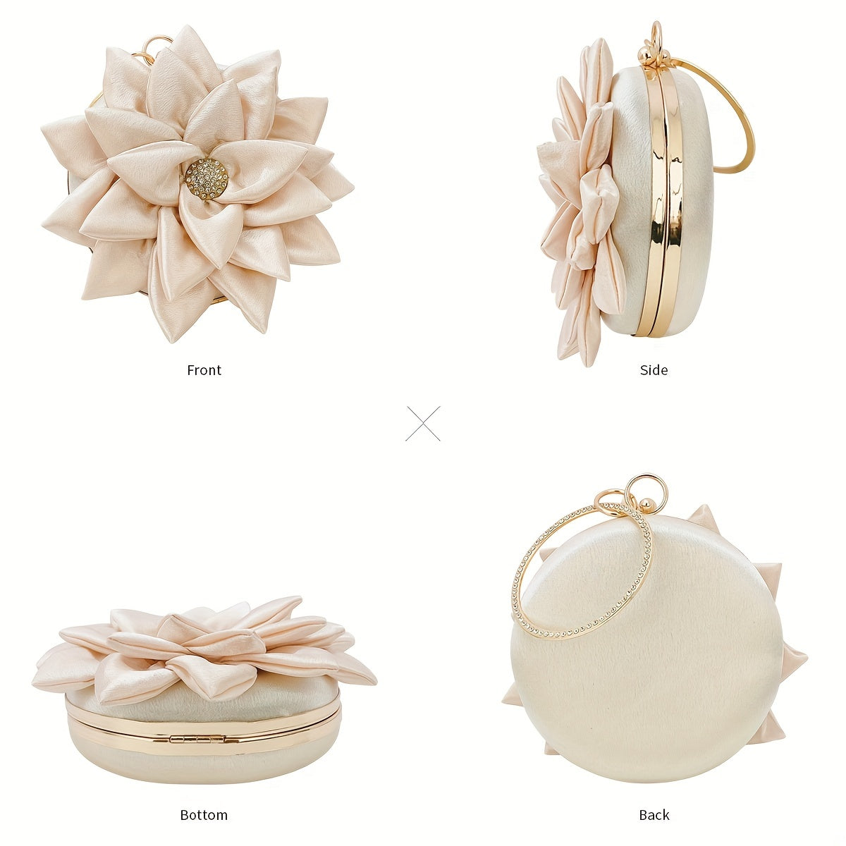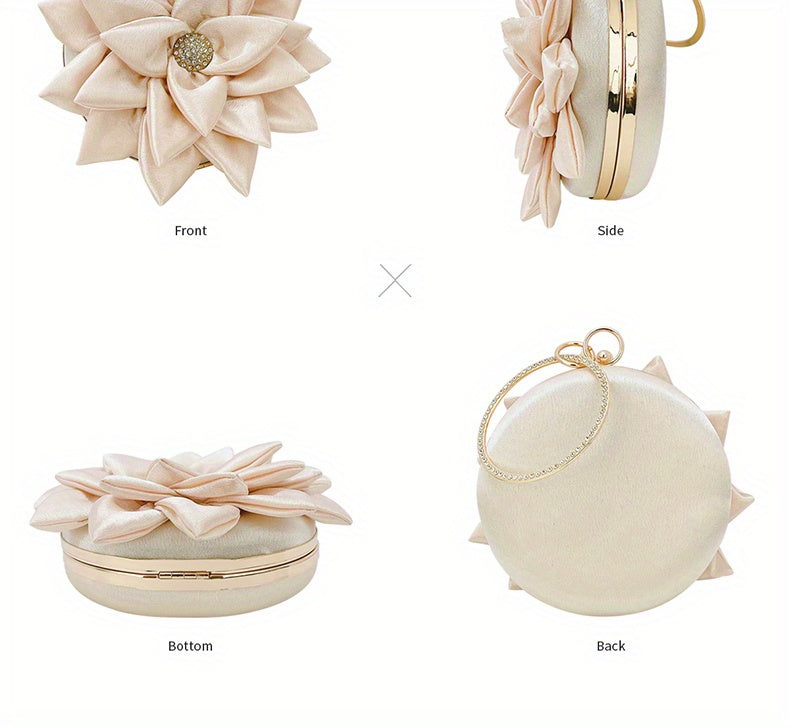 3D Flower Round Evening Bag – Elegant satin clutch purse adorned with 3D floral details and glitter accents. Features a stylish top ring handle for easy carrying, perfect for weddings, parties, banquets, carnivals, and music festivals. Compact yet spacious enough for essentials like phone, keys, and makeup, adding a glamorous and sophisticated touch to any outfit.