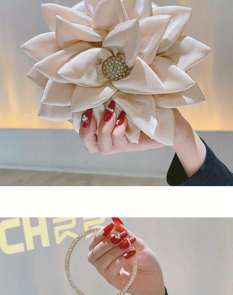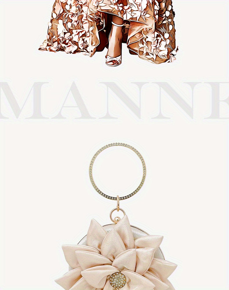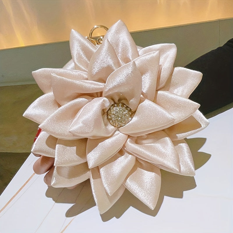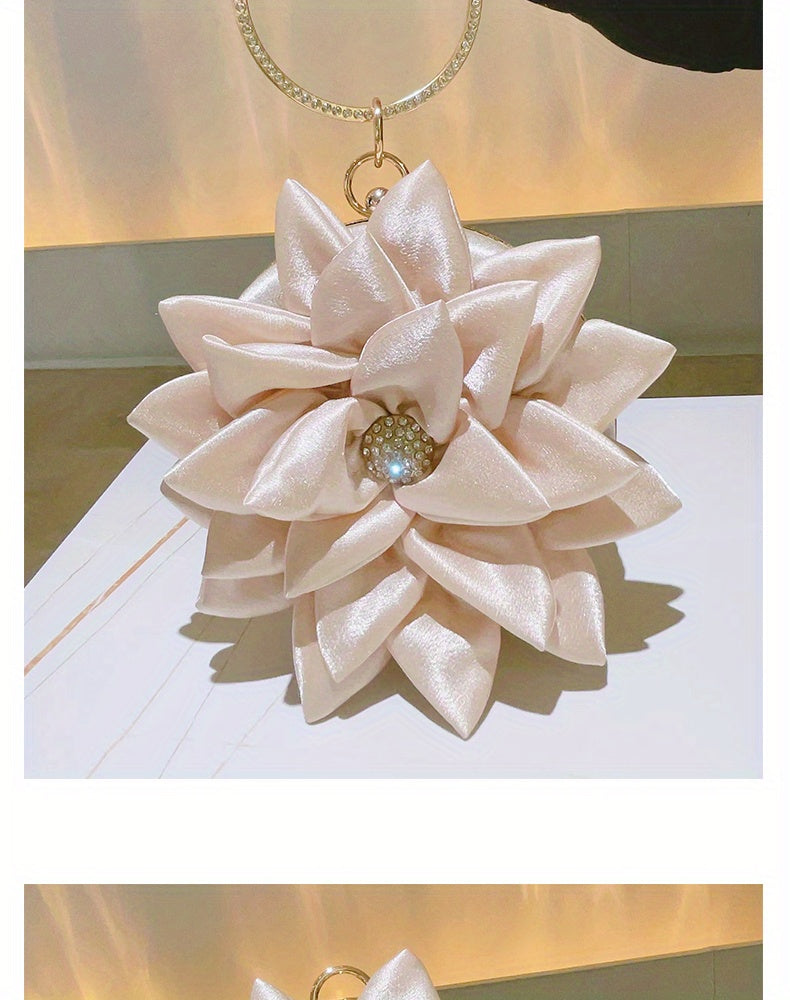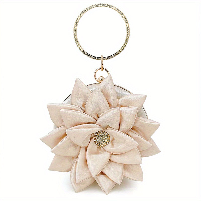3D Flower Round Evening Bag, Satin Clutch Wedding Purse, Glitter Top Ring Handbag For Party Banquet for Carnaval Music Festival