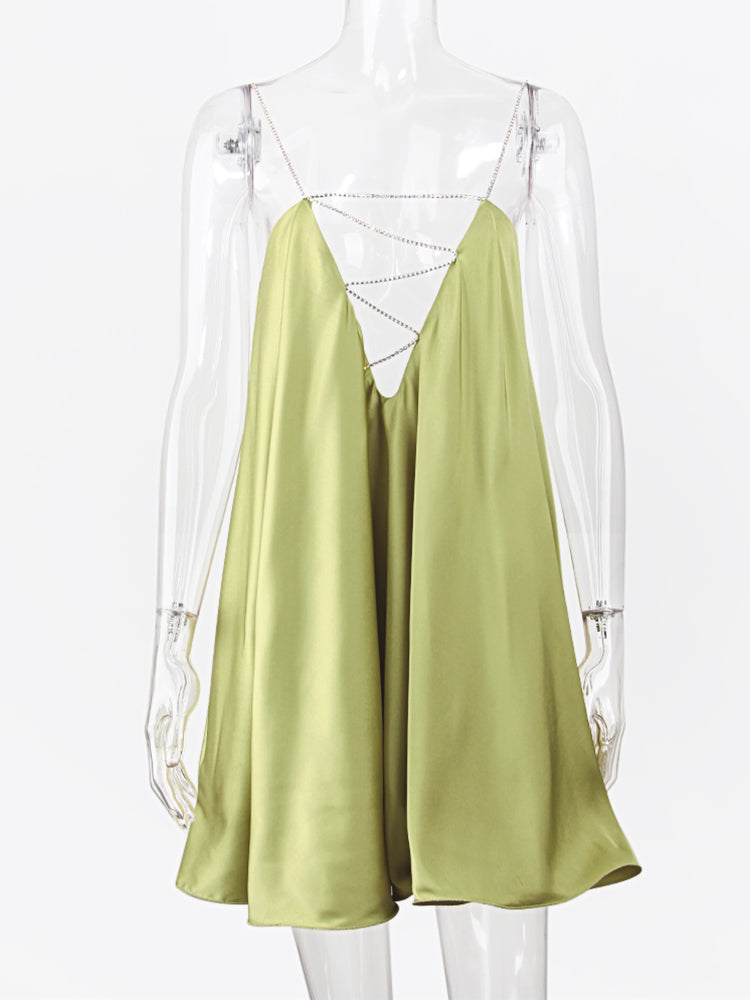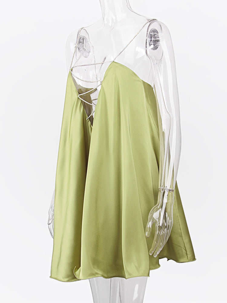 Diamond Chain Satin Swing Dress – Women’s Low Back Party & Club Dress with Crystal Straps