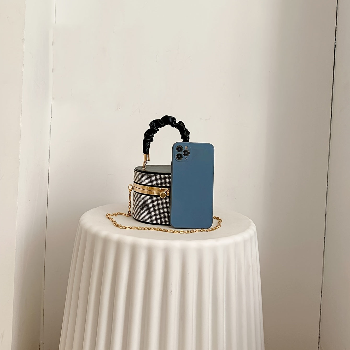Mini Allover Rhinestone Handbag, Ruched Detail Evening Bucket Bag, Stylish Chain Shoulder Purse For Party Inch - Rhinestone & Chain Detail - Perfect for Evening Events & Parties - Ideal Gift for Women - For Car