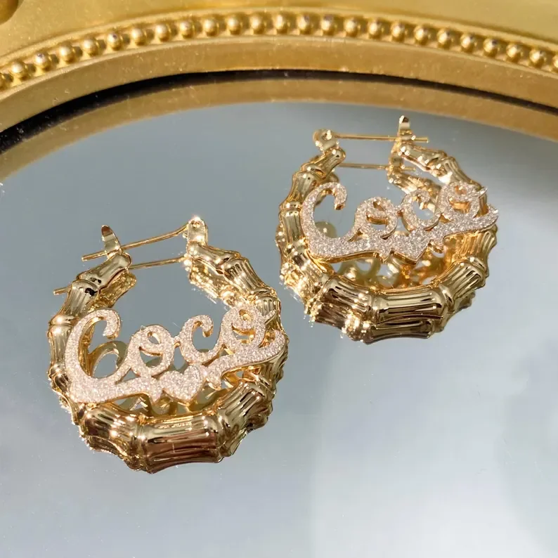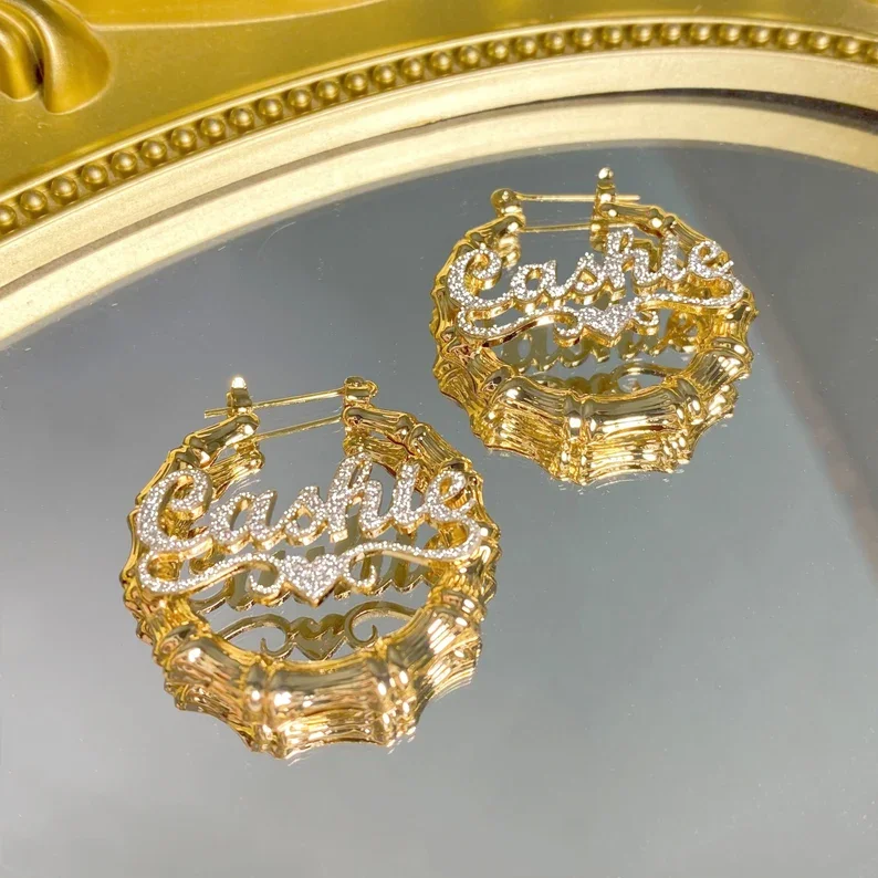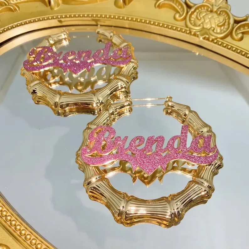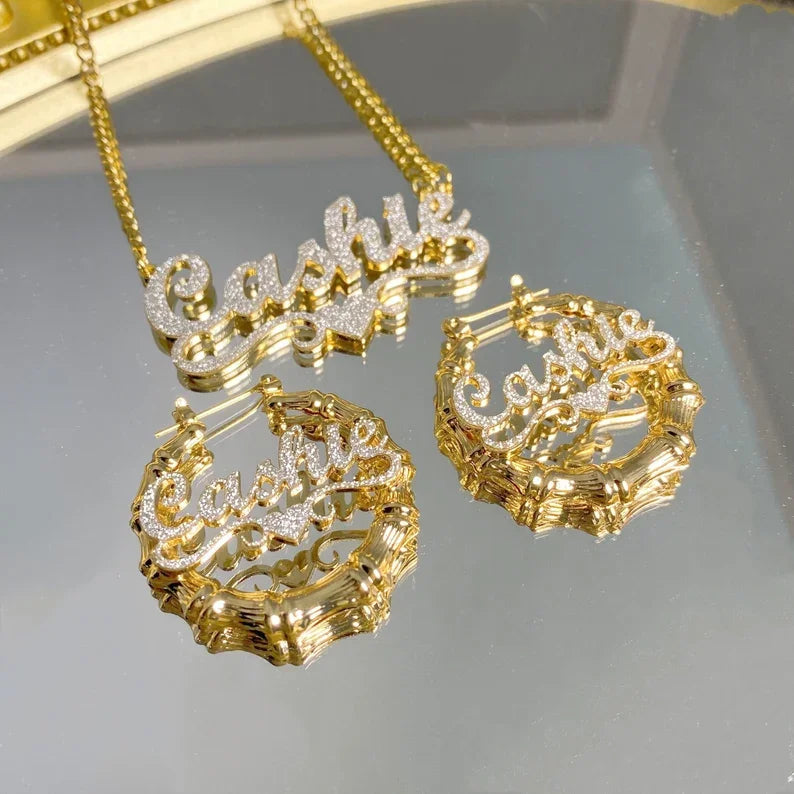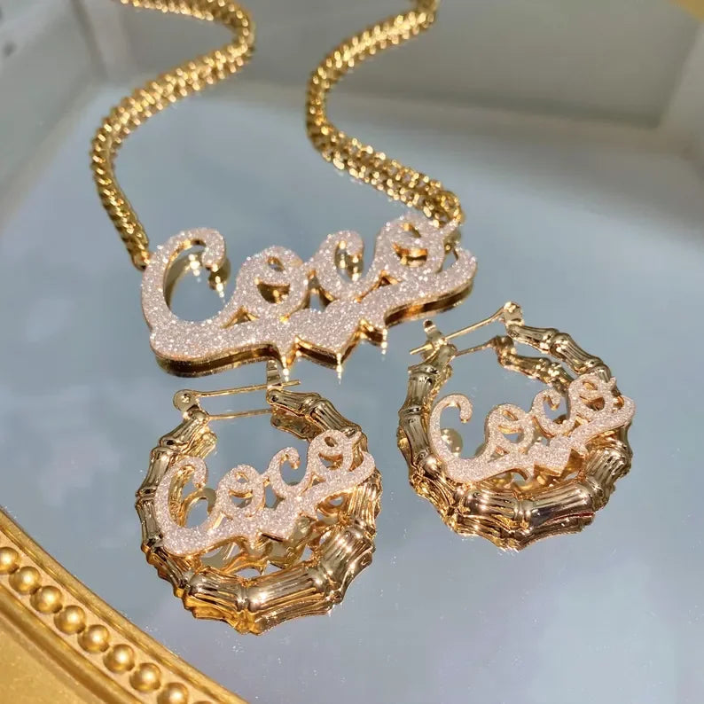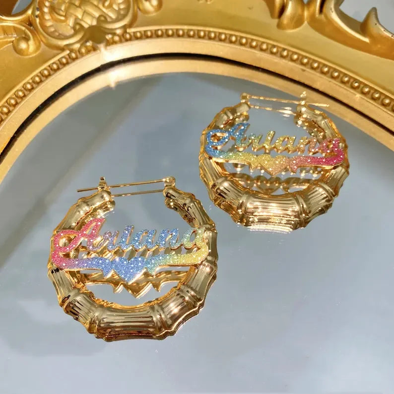 Crafted from durable stainless steel, the set features <strong>rainbow color hoop bamboo earrings</strong> and a matching <strong>custom name necklace</strong>.