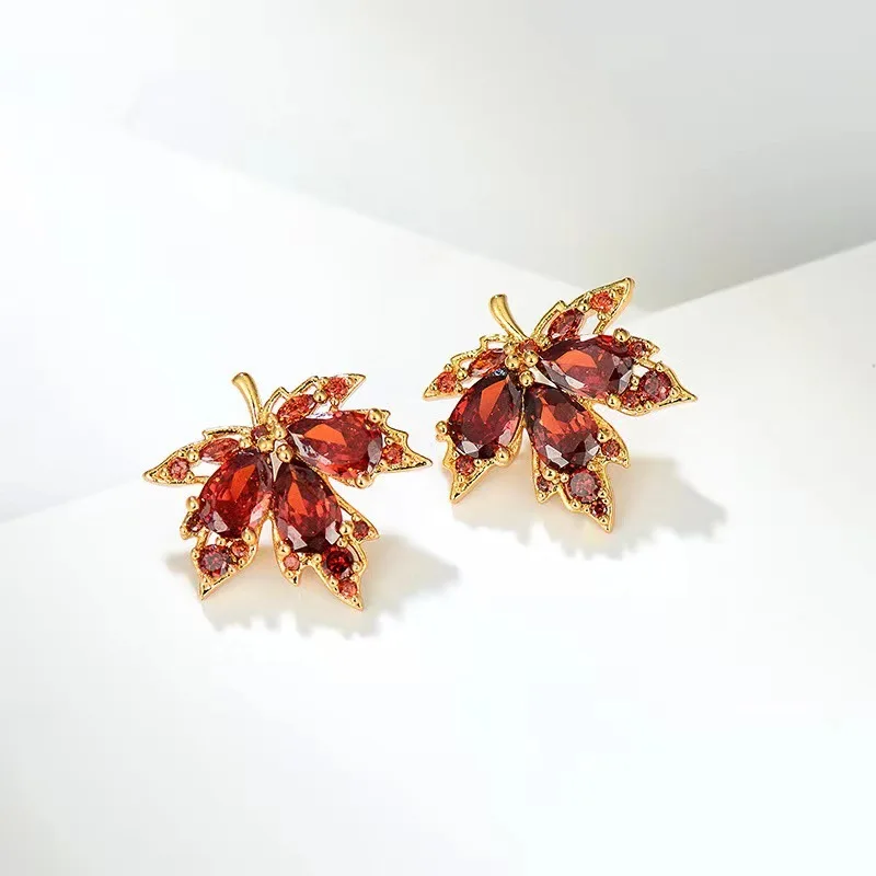 Red Gem Maple Leaf Stud Earrings for Women New Fashion Light Luxury Earrings Retro Simple Crystal Earrings Jewelry