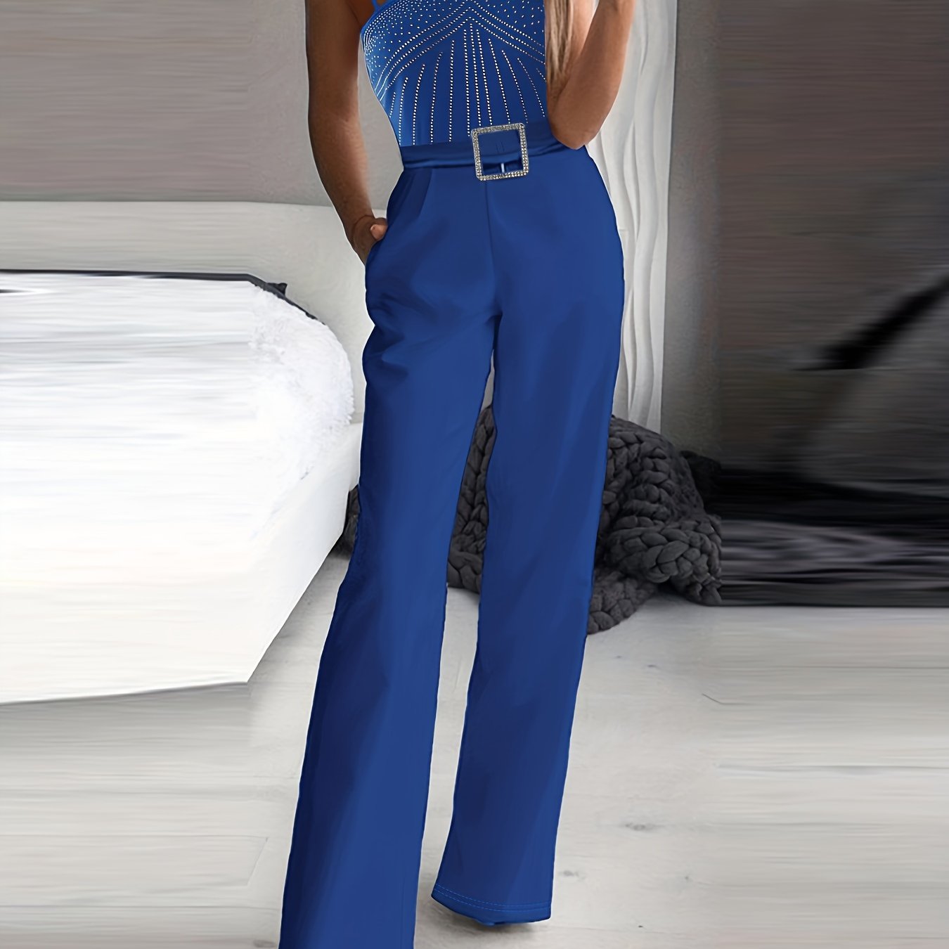 Rhinestone Embellished Wide Leg Jumpsuit - Sleeveless, Halter Neck, Slim Waist, Cut Out, Micro Elasticity, Polyester Fabric - Hand Wash, Summer Casual Wear for Women