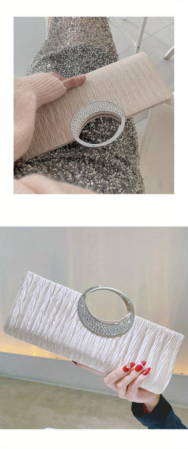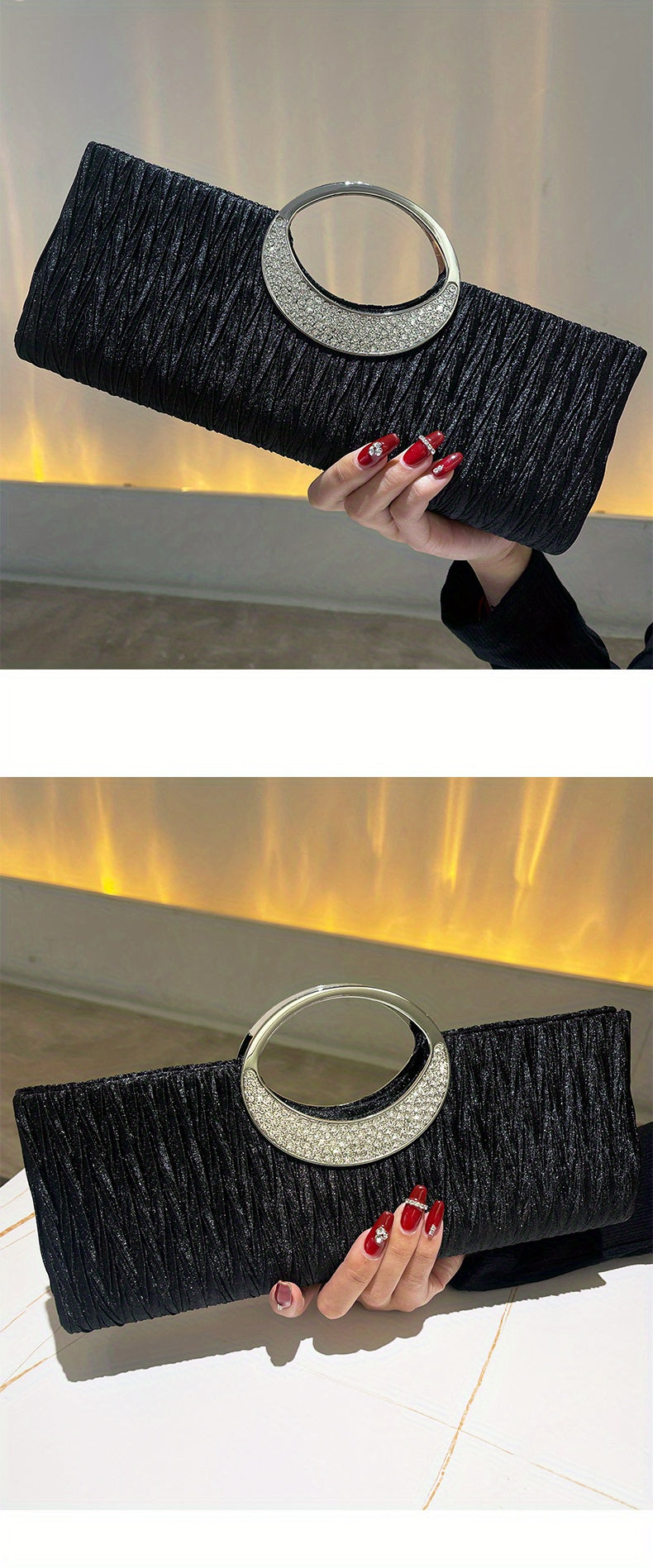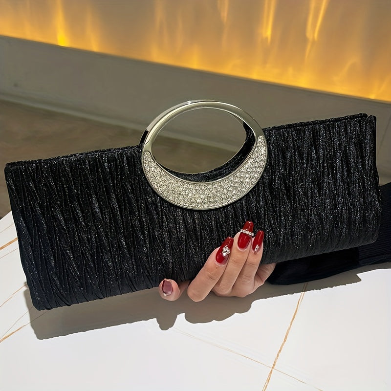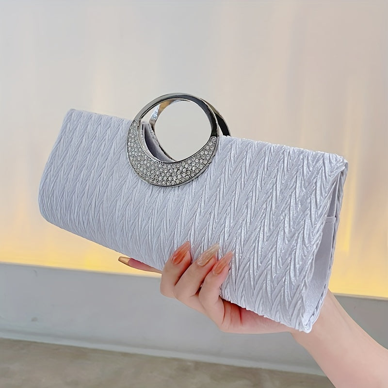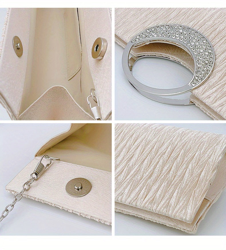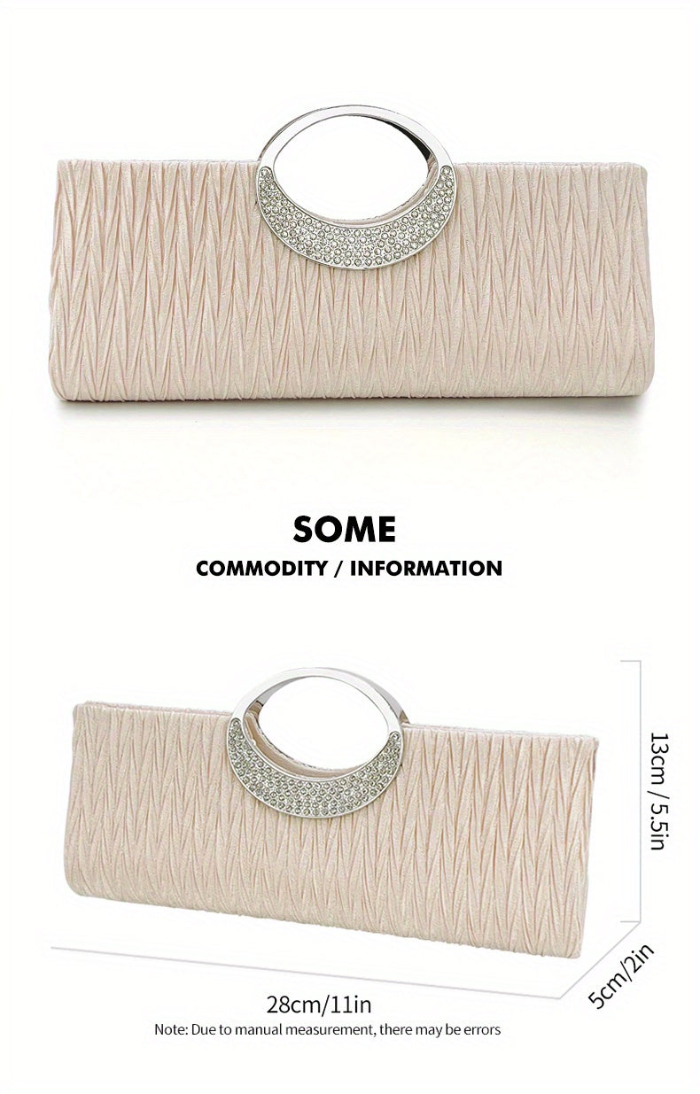 Ruched Satin Evening Bag – Elegant clutch purse for women, adorned with sparkling rhinestone details. Perfect for parties, weddings, proms, and special occasions, this stylish bag combines sophistication with practicality. Compact yet spacious enough for essentials like phone, keys, and makeup, adding a glamorous and refined touch to any evening outfit.