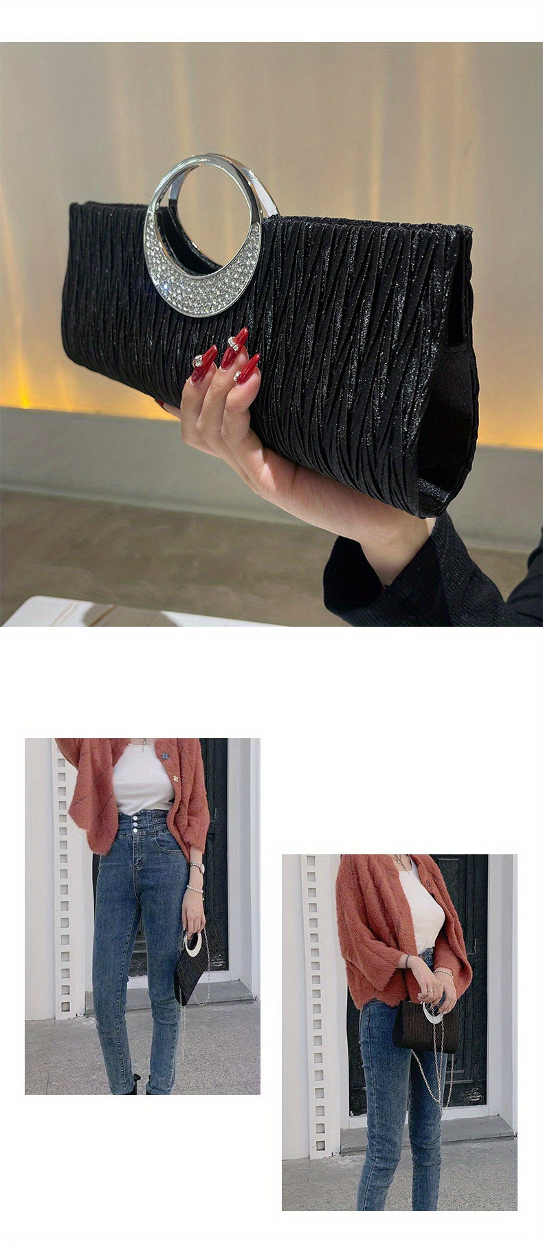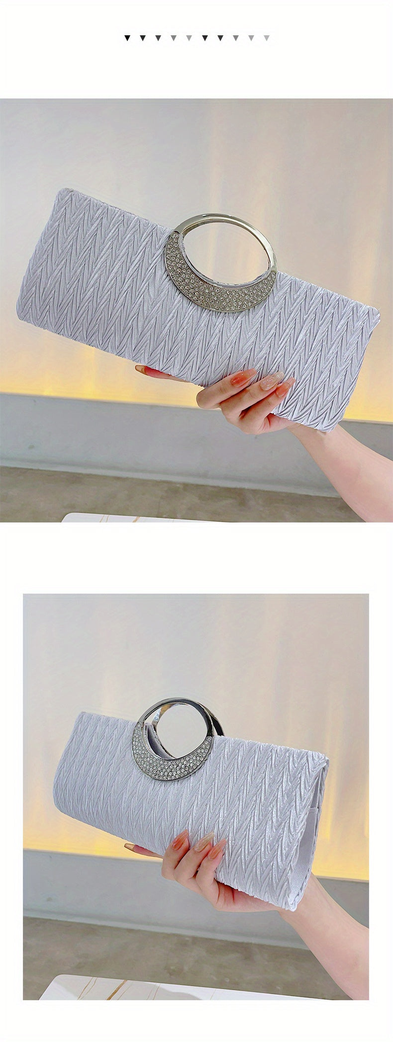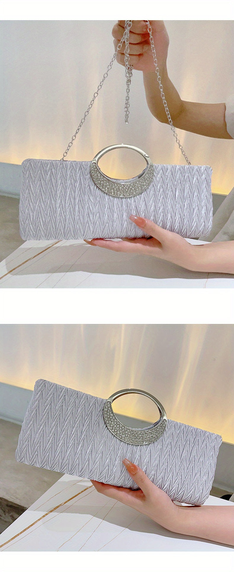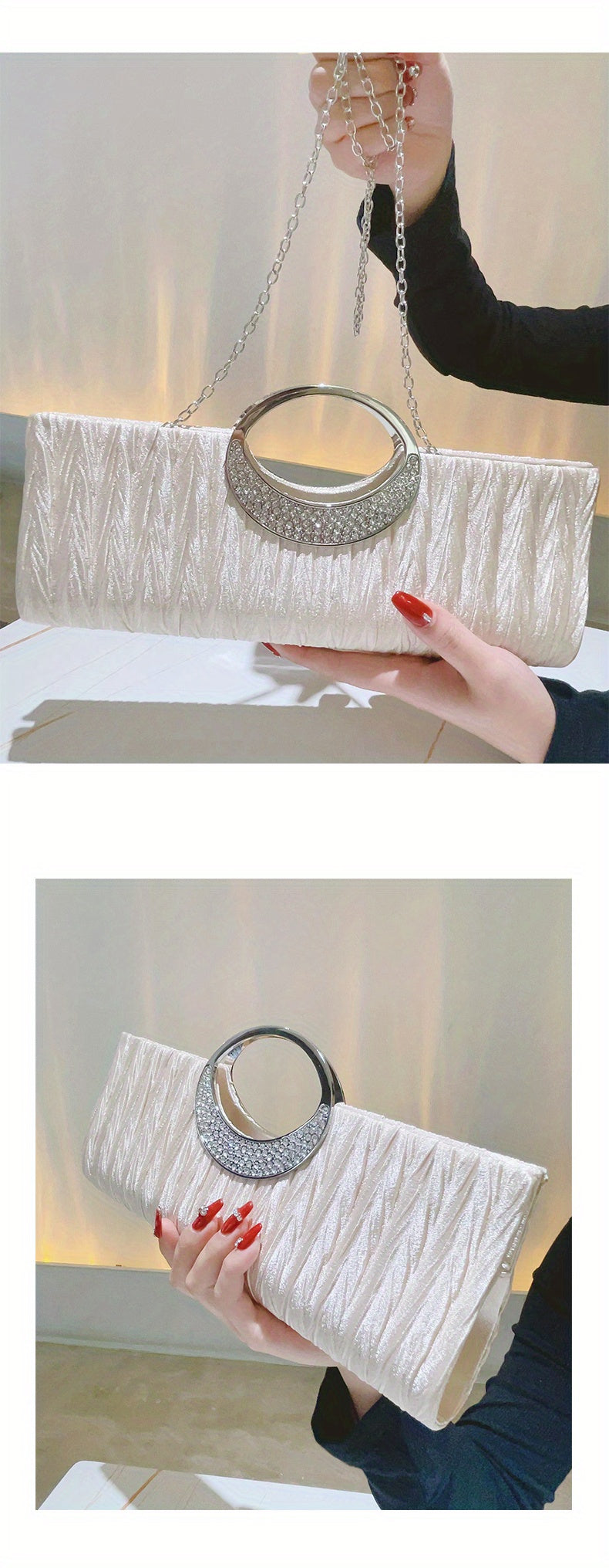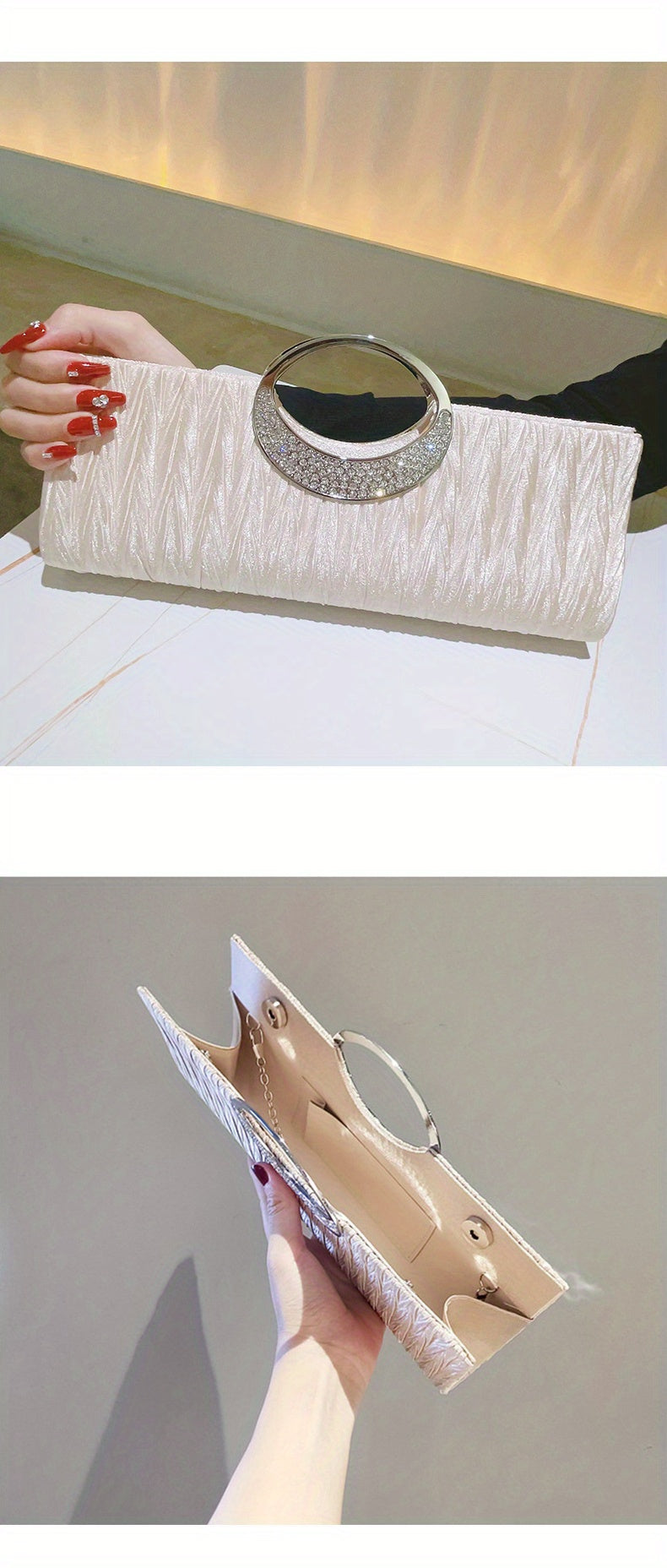 Ruched Satin Evening Bag – Elegant clutch purse for women, adorned with sparkling rhinestone details. Perfect for parties, weddings, proms, and special occasions, this stylish bag combines sophistication with practicality. Compact yet spacious enough for essentials like phone, keys, and makeup, adding a glamorous and refined touch to any evening outfit.