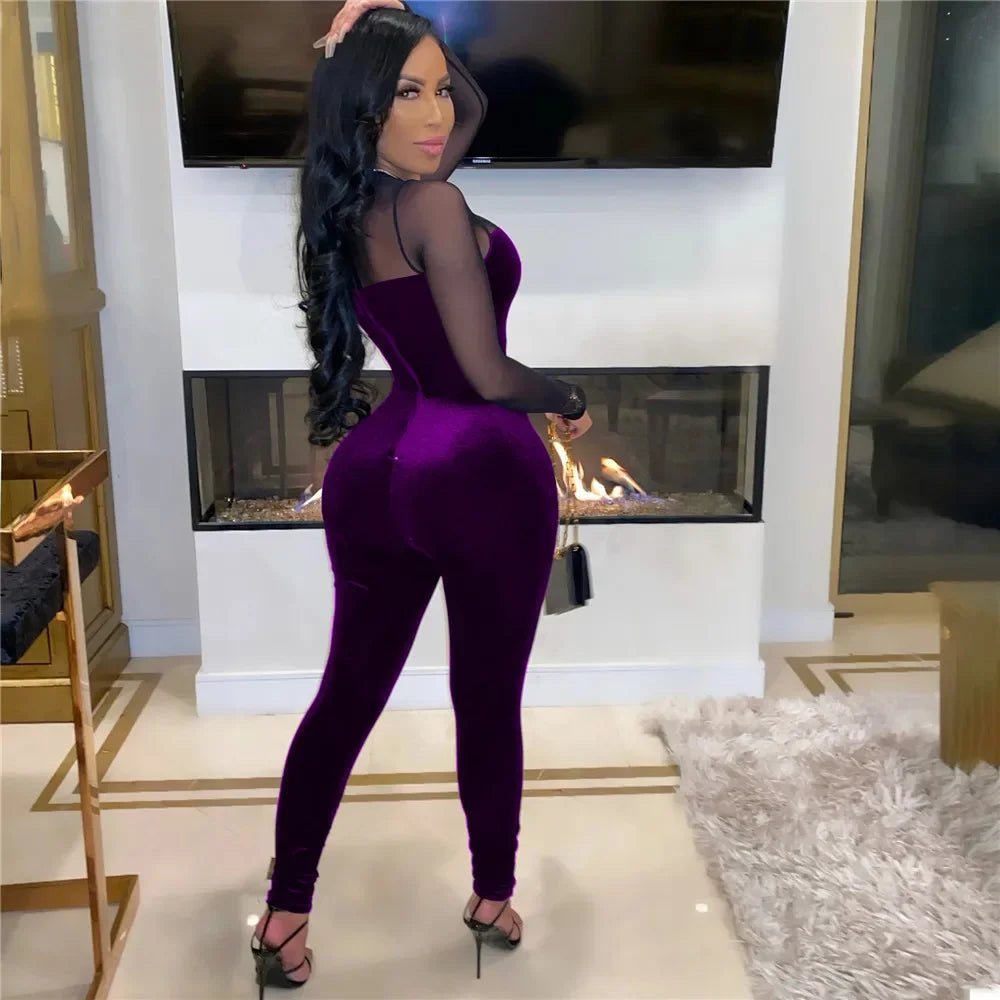 Sexy Sheer Mesh Patchwork Velvet Jumpsuit Women Long Sleeve Skinny Rompers Womens Jumpsuit Elegant Slim Bodycon Party Overalls