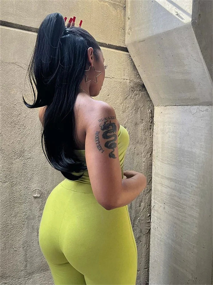 Simenual Y2K Green Floral Two-Piece Set – Strapless Tube Top & Flare Pants Co-ord Outfit