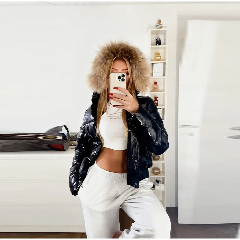Women Glossy Surface Hooded Padded Jacket Fashion Faux Fur Zipper Cropped Jackets Lady