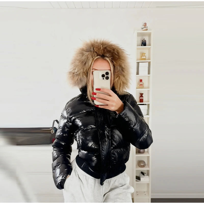 Women’s Glossy Hooded Padded Jacket – Faux Fur Cropped Winter Coat